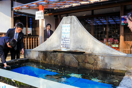 那么多人就挤在四合目小平台上留念。。。。。哎。。。好冷。下雪。。。上车走人。。去参观雪山下的小村子,忍野八海。。。。其实也就是在村子里新修个旅游购物店。。。。