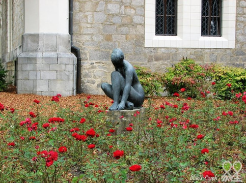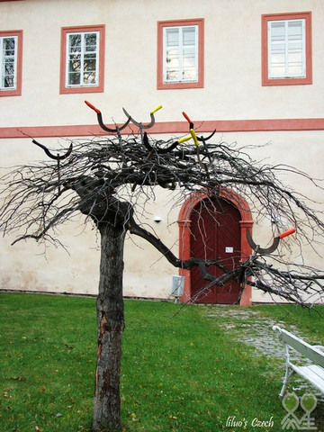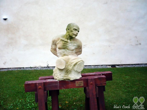 小镇中有一座小小的教堂。尤其与布拉格众多的恢弘的教堂相比,CK这座实在是袖珍小巧。而记忆深刻的是小广场上独特的雕塑,与一般教堂庄严、整洁、神圣的外饰呈现出较大的不同。双手被缚,上身赤裸,面容扭曲的男人。枯木上插满的镰刀。让人产生一种痛苦的煎熬之感,畏惧得要做个好人。