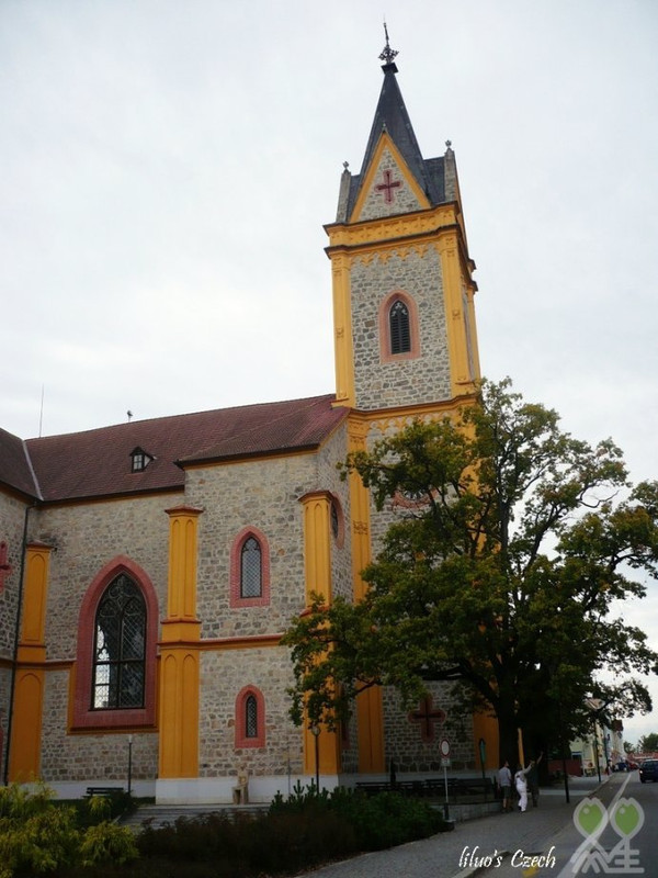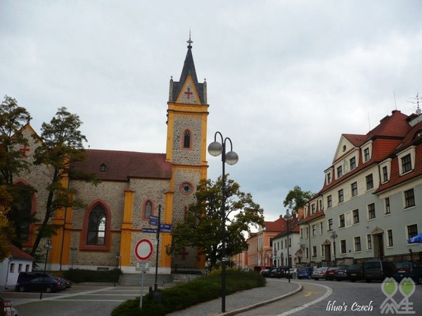 Hluboká城堡(中文译名胡波卡城堡,我更愿意称之为白鹿城堡)位于离CB十余公里的小山包上。做bus前往,大约二十多分钟的时间。bus停靠在类似于公交站的路边小站,下车后第一眼看着这座黄色的教堂。
