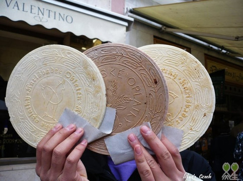小镇上随处可见卖温泉饼的小摊,一摞摞整齐的码好,像是充满韵律的唱片。虽然也有包装好的礼盒,甚至在布拉格的超市里花50-60捷克克朗也可以买到一盒,但是身在KV,自然是要尝一尝波西米亚姑娘们亲手制作的温泉饼了。一口下去,松脆喷香,舒坦。