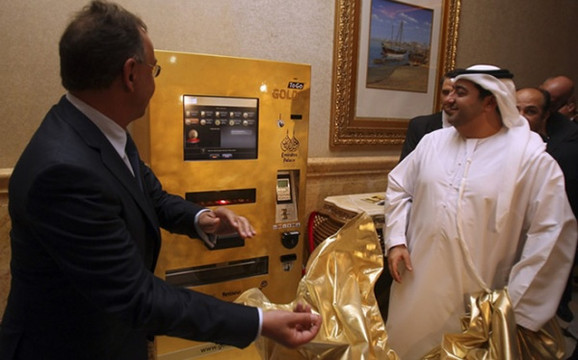 既然自动售货机可以贩卖手机、化妆品、鞋,那为什么不能售卖珠宝和贵重金属呢?2010 年,一台独一无二的黄金贩卖机就在阿布扎比的凯宾斯基 Emirates Palace 酒店亮相。这台机器与 ATM 类似,但它吐出的不是钱币,而是特别设计的 24K 金币,每一枚在 10g 左右。德国人 Geissler 发明了这台机器,背后负责操作的则是一家进行贵金属贸易的公司 Ex Oriente 。目前这台黄金贩卖机已在美洲和欧洲多个国家出现。