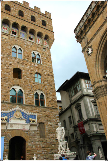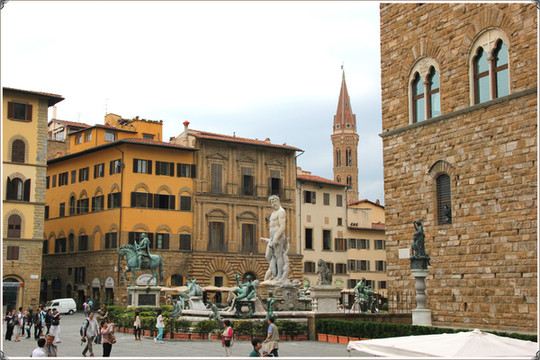 广场中央的海神青铜雕像喷泉,是16世纪巴尔托洛梅奥·阿曼纳蒂的雕刻名作。1565年在弗朗切斯科一世·德·美第奇和奥地利的约翰娜举行婚礼之际下令修建。白色的海神“波赛冬”挺立于喷泉中心的双轮黄金海马车上,水池四周边有多姿多彩、形态各异的青铜雕像。