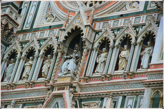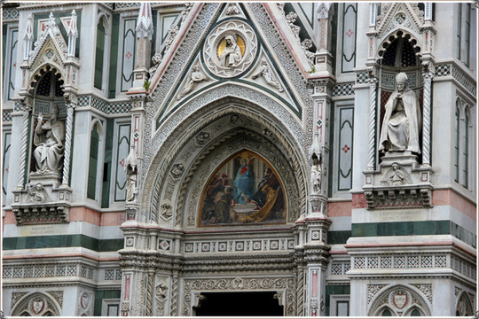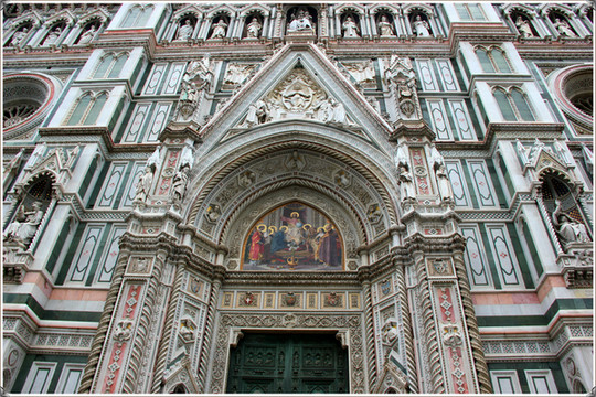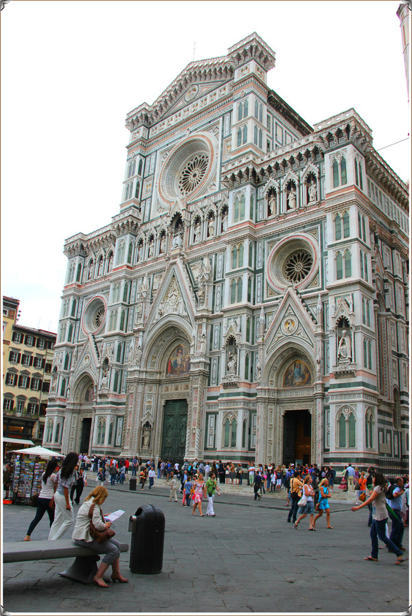 圣母百花大教堂是世界五大教堂之一,排名世界第四,是天主教佛罗伦萨总教区的主教座堂。教堂建筑群由大教堂、钟塔与洗礼堂构成,1982年作为佛罗伦萨历史中心的一部分被列入世界文化遗产。它是佛罗伦萨的地标,这座哥特式建筑,高106米,其外部以绿、白、粉红三色大理石装饰,