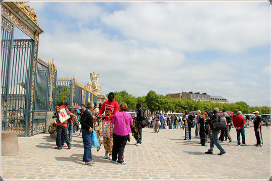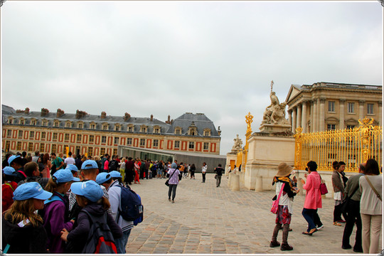 我们一早就出发前往凡尔赛宫,但到达时大门口已经排了很长的队,自由行和团队是分两边进的,所以我们的入园的速度还是比较快的。在等候进门时,凡尔赛宫的金色大门就让人震惊无比,似乎是我见到过的宫殿大门里最为惊艳的了。当然大门里的建筑群更是宏伟壮丽。