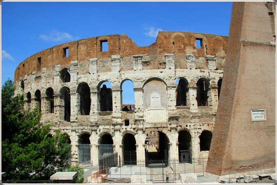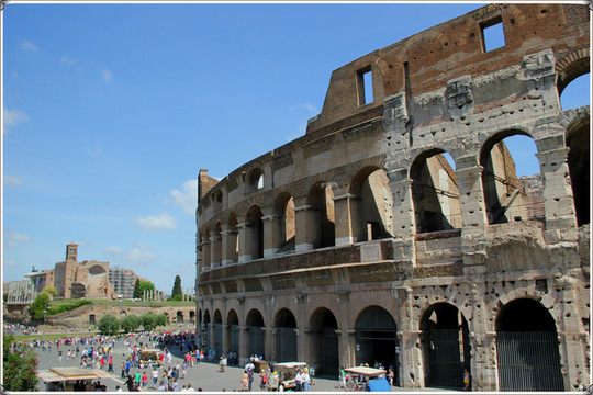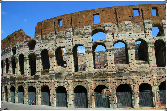 古罗马斗兽场是古罗马帝国专供奴隶主、贵族和自由民观看斗兽或奴隶角斗的地方。斗兽场的看台用三层混凝土制的筒形拱上,每层80个拱,形成三圈不同高度的环形券廊(即拱券支撑起来的走廊),最上层则是50米高的实墙。看台逐层向后退,形成阶梯式坡度。每层的80个拱形成了80个开口,最上面两层则有80个窗洞,