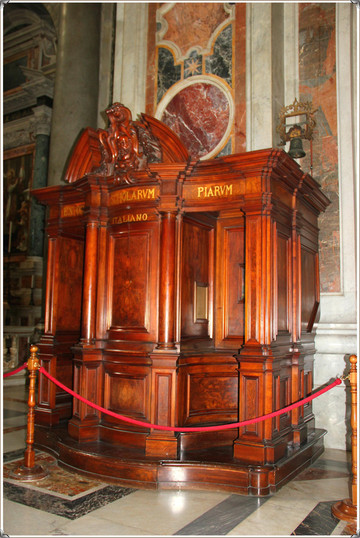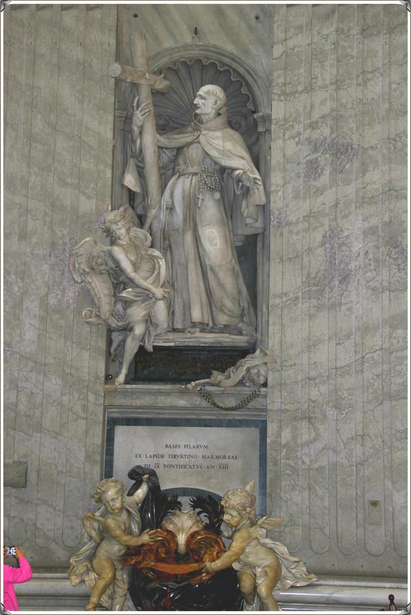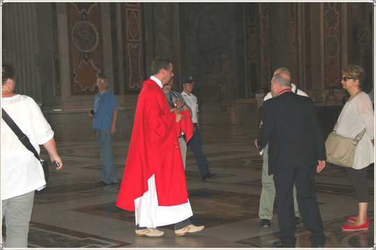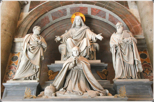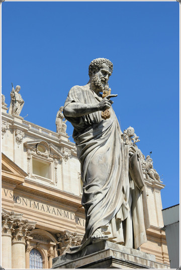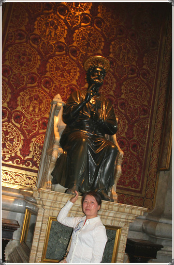 圣彼得的青铜塑像,圣彼得左手握钥,右手高举,正襟危坐,表示“祝福”。据说摸摸圣彼得的右脚可以神的保佑和好运。。。