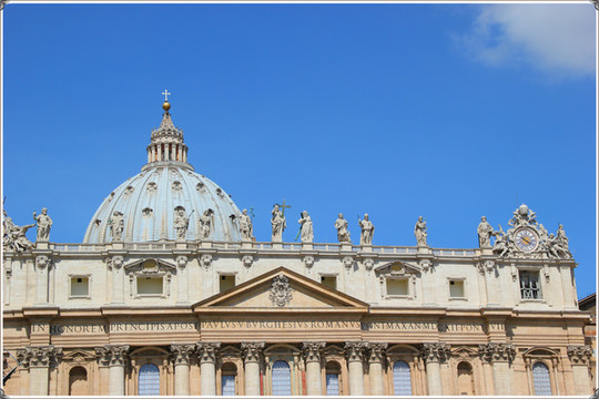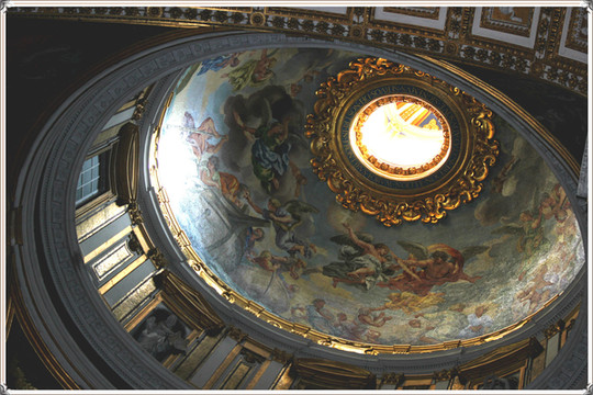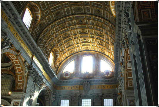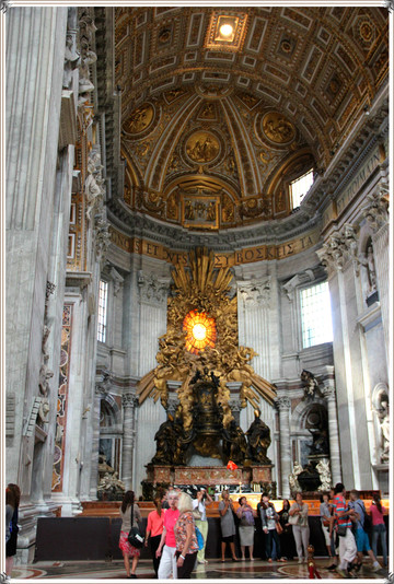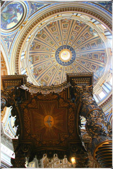 圣彼得大教堂中央为最著名大拱形屋顶是米开朗境罗的杰作,双重构造,外暗内明。圆顶下是教皇的祭坛,用贝尼尼创作的青铜华盖覆盖着。那扭曲的粗圆柱似的独特形状很引人注目。