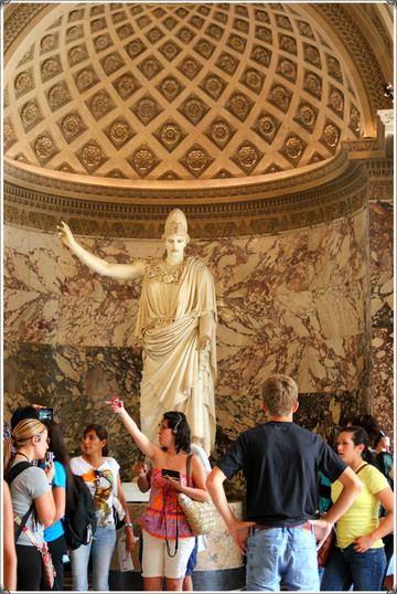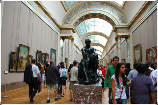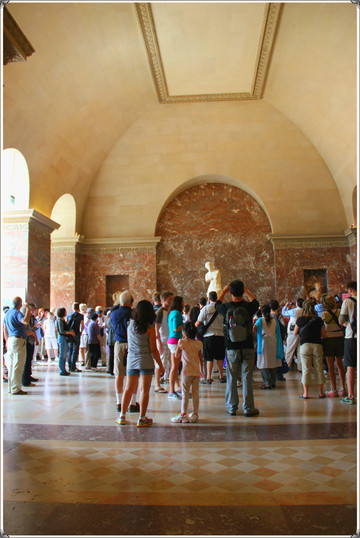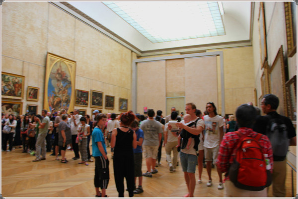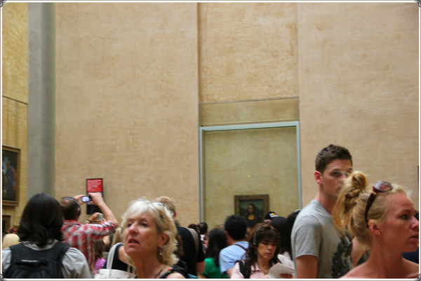 在德农馆里,蒙娜丽莎前拥满了来看望她的来自五湖四海的人们,我没想到的是“蒙娜丽莎”的画是这么小的一幅,我的个子矮几乎看不到她的脸,于是只能在人群中左拐右挪挤到她的面前。如果有一天我可以一个人静静地呆在她的面前好好的看看她,那会是一种怎样的心情?