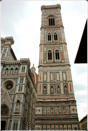 乔托钟塔,由建筑家乔托于1334年开始建造,外观是一个四角形的柱状塔楼,把粉红、浓绿和奶油三种颜色,以几何学的配色方式调合,和旁边的百花教堂十分和谐,底部还有精致的浮雕,内部有楼梯可达顶部,共有290阶。