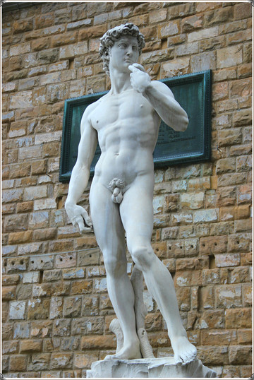 米开朗基罗的雕塑大卫雕像,大卫是圣经中的少年英雄。这座高5.5米的雕像,人体的肌肉比例极尽完美。米开朗基罗精研肌肤、血管纹路及关节,这尊雕像被认为是西方美术史上最值得夸耀的男性人体雕像经典之一。