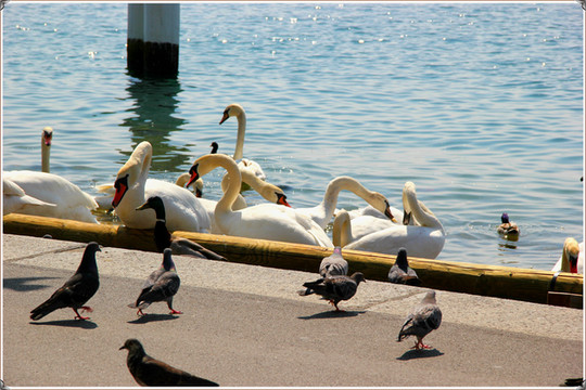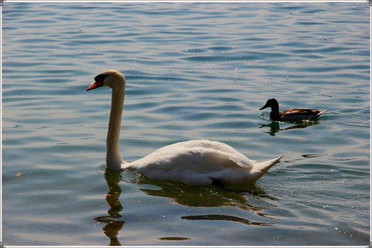 湖里天鹅悠闲的游来游去,静静的坐在湖边,看着美景不仅陶醉了。