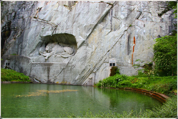 【狮子纪念碑(Löwendenkmal)】:位于冰河公园内。美国 小说家马克吐温曾赞颂卢塞恩 的石狮是“世界上最哀伤、最感人的石雕”。是琉森数一数二的雕刻作品,一只折断了的长矛深深地插进了濒临死亡的雄狮背上,狮子面露痛苦的神情。爪按盾牌和长矛,盾牌上有瑞士国徽。这只狮子的艺术感染力,的确能够让所有站在它面前的人都从心底里感受到一种不可抑制的悲伤。