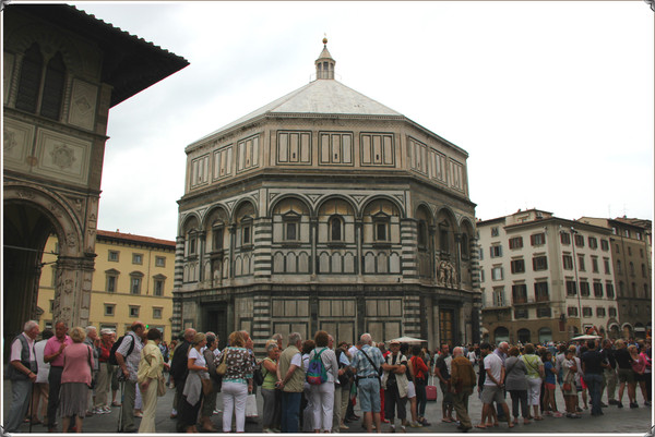 圣母百花大教堂对面的圣乔凡尼礼拜堂,它是一座八角形的教堂,建于5世纪~8世纪间,是托斯坎尼地区罗马式建筑的代表。礼拜堂最具观光价值的就是三面青铜门浮雕:入口处南侧的青铜门是由安德烈.比萨诺于1330年制作的,28张图样是关于约翰传教的故事;东侧礼拜门是由吉尔伯提自1425年起花27年时间所制作,十张图样描述亚当和夏娃及旧约圣经的题材;北侧青铜门也是吉尔伯提的作品,由28张图样组成,主题是表现基督的生涯及其12门徒的事迹。