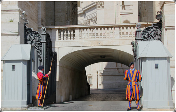 大教堂的皇家卫队就是梵蒂冈国家的军队,卫士们个个高大魁梧,他们身穿红黄蓝三色条纹的古代骑士服装,手握长戟,威风凛凛。16世纪初教皇受到了神圣罗马帝国的进攻,为了保卫教皇,100多个瑞士卫兵战死在教堂外,当时的教皇非常感动,于是决定世世代代雇佣瑞士卫兵保卫教堂。