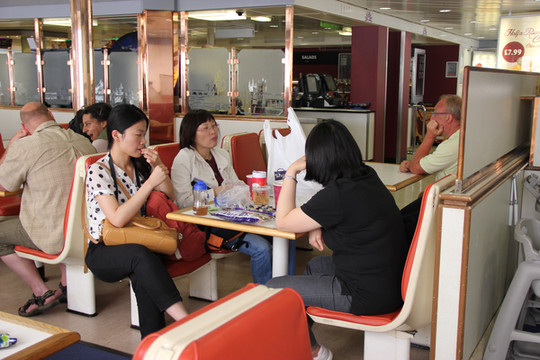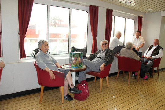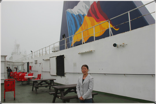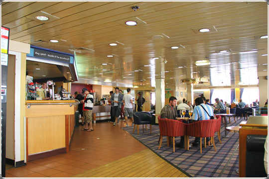 在渡船上,每一层都有咖啡屋、酒吧和自助餐餐厅,自动贩卖机更是随处可见。闲了可以玩玩游艺机,我们在船上的免税商店买了少东西。船上还有儿童房和Spa,最惬意的是坐在临窗的沙发上,看着茫茫一片的海峡,或者读本旅游杂志,近两个小时的航程过得也很怡然自得根本不会寂寞。
