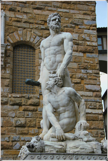 赫拉克里斯与卡柯斯雕像:强盗卡库斯趁赫拉克勒斯不注意时偷走红牛,因为牛的鸣叫而惊动赫拉克勒斯,立刻追上前来砍了他的脑袋。