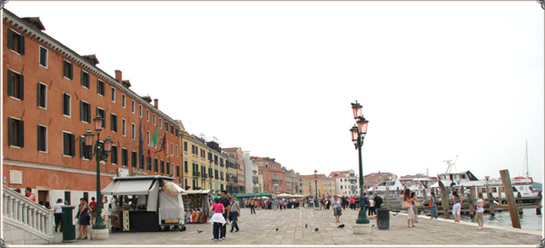 登上威尼斯岛,就是斯拉夫人堤岸,在斯拉夫人堤岸上有许多出售纪念品的摊位和商贩。