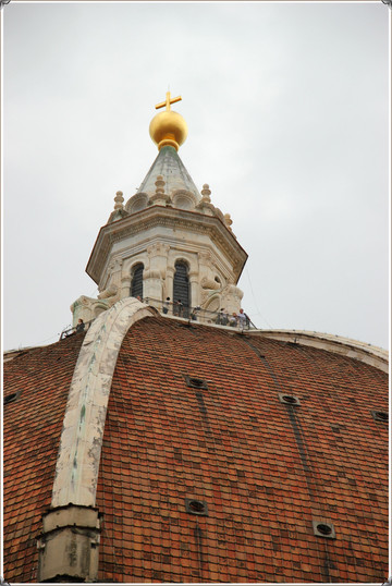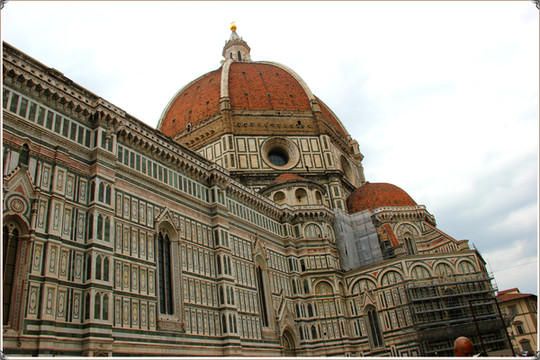 圣母百花大教堂的中央巨大圆顶是由名建筑家布鲁内勒斯基所建造的第一座文艺复兴式圆顶,共花了十四年的时间才完成,她有着一个橘红色巨大的圆顶,所以很好认,远远地就能看见它,这也几乎成了佛罗伦萨的重要地标。百年之后,米开朗基罗在罗马也建了一座类似的大圆顶,却自叹不如:“我可以建一个比它大的圆顶,却不可能比它的美。