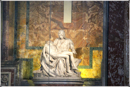 米开朗琪罗的圣母哀痛雕像,基督耶酥被犹太总督抓住并钉死在十字架上之后,圣母玛丽亚抱着基督的身体痛哭的情景。这是米开朗琪罗的雕塑作品中唯一有著名的作品。