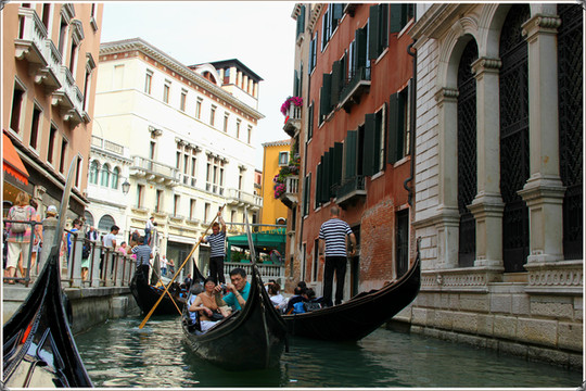 贡多拉多用于游客游览的代步工具。贡多拉就在这狭窄的水道中穿行。连接街道两岸的是各种各样的石桥或木桥。它们高高地横跨街心,一点也不妨碍行船。