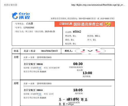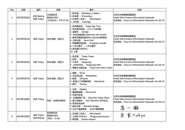 第一天:2015年5月4日。北京首都机场至东京成田机场,航班NH956,时间:上午08:30 – 下午13 :00。从成田机场到酒店是乘坐airport limousine bus,用时一小时到达酒店,时间:下午13:20 - 14 :20。