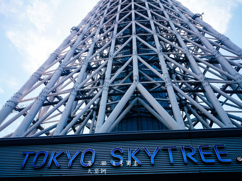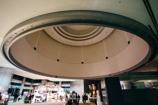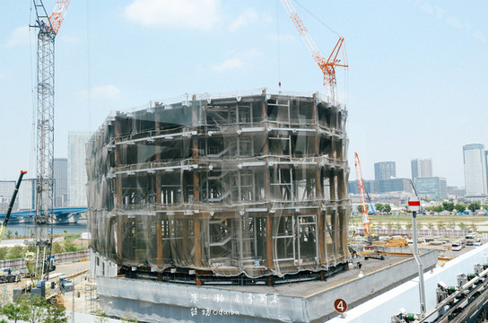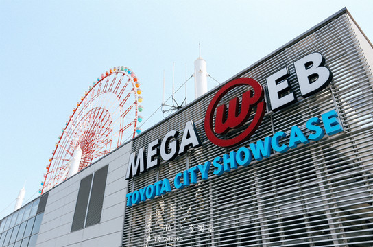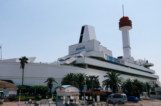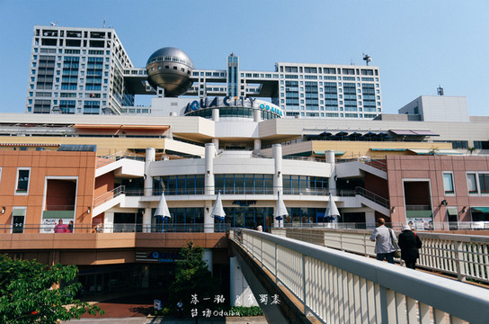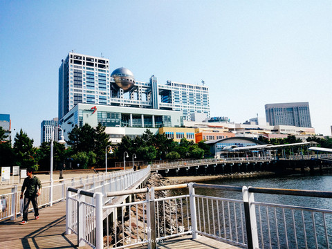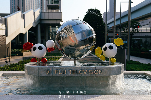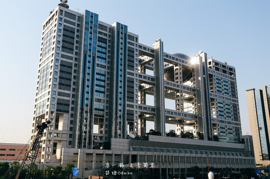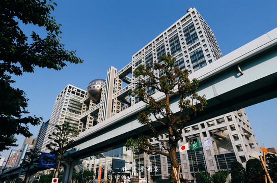 路上看到富士电视台。造型独特的大楼,顶部悬有醒目的圆球建筑,门口有最新节目的展播屏,晚上圆球会闪烁着多种颜色的灯光。大楼内有向一般公众开放的球形展望室、剧院广场、奇妙走廊以及餐厅等设施。