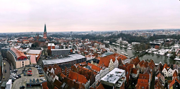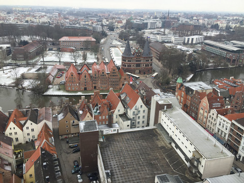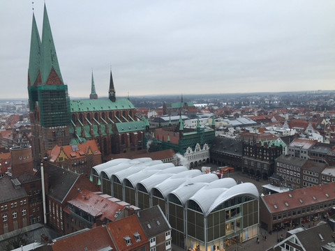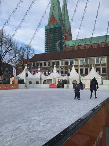 实际出行:飞机到汉堡后,公司安排第二天晚上要一起吃饭,这样汉堡柏林一天来回肯定赶不上晚上吃饭了,而且也不知为啥汉堡到柏林的火车票非常贵,一个多小时的火车单程收费要6,7百人民币, 来回要1300,并且时间也来不急。没办法只好改成去吕贝克小镇转转。第二天一早和小子打车去了汉堡中央火车站,今年真是全球巨冷,东北家里是零下二十几度,汉堡也是零下8,9度,感觉巨冷。还有风,到了火车站也没看到售票处,只能在售票机上买票,想买个来回票,鼓捣半天也没弄明白怎么买,站台上又冻的不行,最后还是买了单程的全票,后来听小子说他同学告诉的来回票能省个30%左右。没办法,没弄明白啊。吕贝克是德国的一个小镇,里面有很多教堂,我们在里面转了几个教堂,还是感觉很冷,找了个咖啡馆坐下喝了杯咖啡,看对面德国人自己浇了个冰场,好多小孩在滑冰,想起当年在沈阳读书时,学习里年年浇冰场。