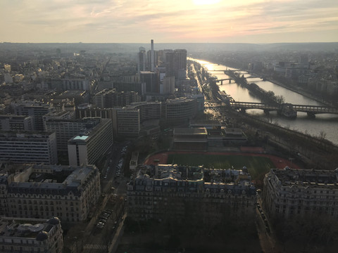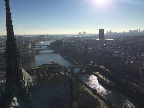 第三天起来,决定从南边的圣母院开始往北边走。上地铁先到圣母院转了下,圣母院进门不要钱,我们就到里面祈祷的地方坐了一会,听着里面的音乐,静坐了半个小时。钟楼去年上5欧,今年10欧了,学生8欧。早上十点开始放人上钟楼,一波大概20个人,我们排在第二波,上去买完票就转着圈开始爬上钟楼,从钟楼上看巴黎的景色,巴黎真的没有太高的建筑。