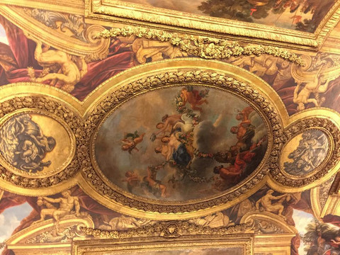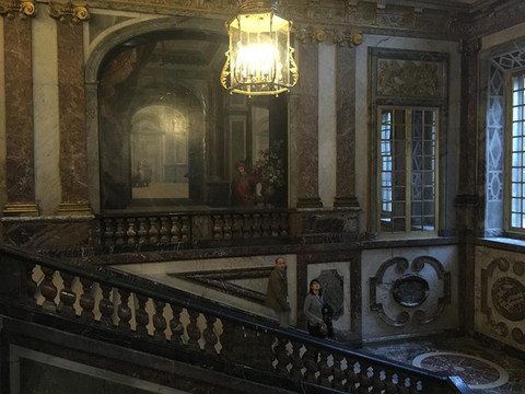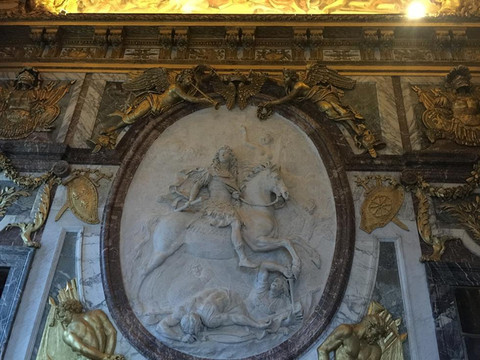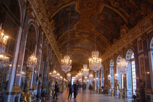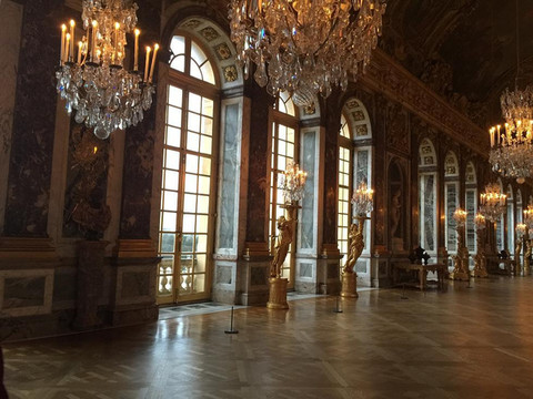 宫殿里装修得富丽堂皇,五彩的大理石墙壁光彩夺目,巨型水晶灯如瀑布般倾泻而下,内壁和圆顶上布满了西式油画,画中的神话故事栩栩如生,仿佛在诉说昔日国王的赫赫战功。主要景观集中在主楼二楼,最著名的要属镜廊,位于战争厅以南,西临花园。镜廊内一面是面向花园的17扇巨大落地玻璃窗,另一面是由400多块镜子组成的巨大镜面。