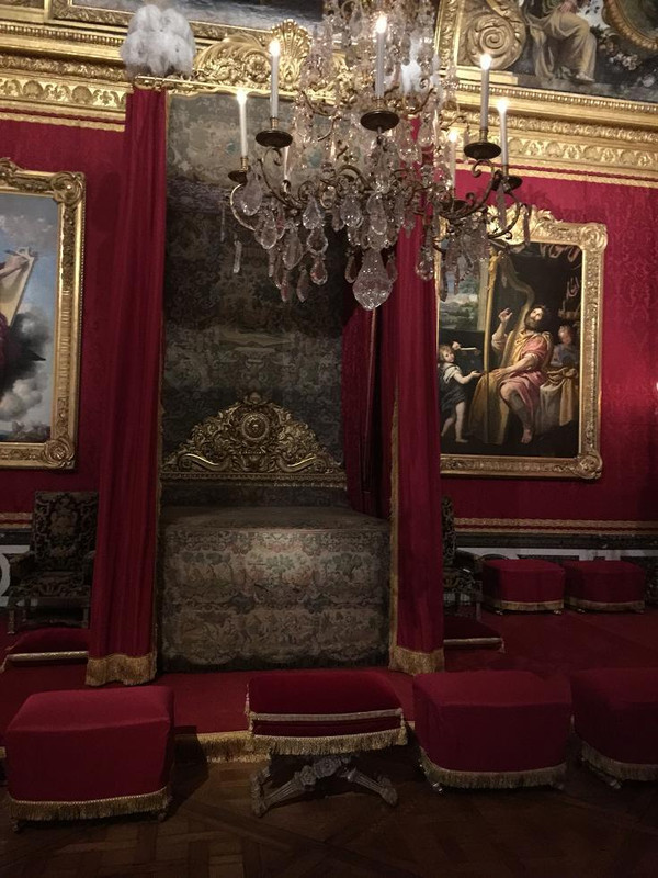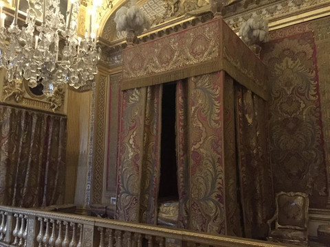 国王寝宫:中央为国王卧室,内有金红织锦大床和绣花天篷,围以镀金护栏,天花板上是名为《法兰西守护国王安睡》的巨大浮雕。