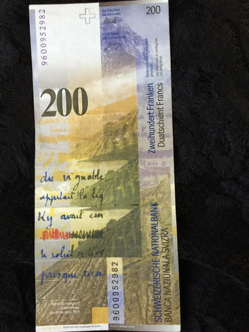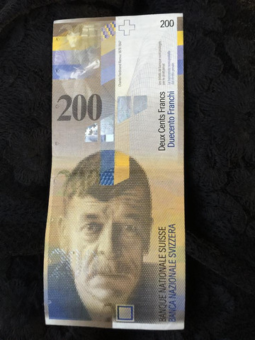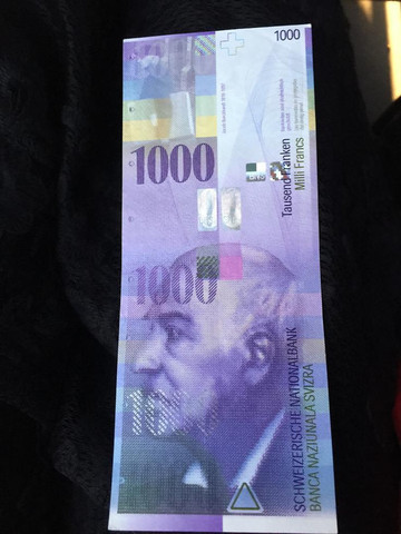 后记:展示下流通率非常低的瑞士法郎。也是哦,一张就价值6600人民币(目前1瑞士法郎=6.6人民币),丢了就要哭死,而且你去买根葱,人家也找不出零钱啊。