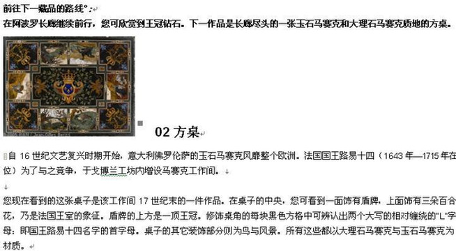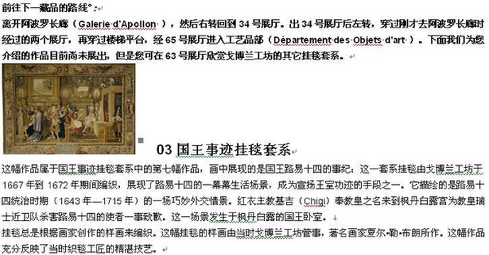 这条线路的一系列代表性作品反映出十七世纪法国王室的无尽奢华和考究,包括挂毯、家具、金制碗碟、装饰花瓶等。