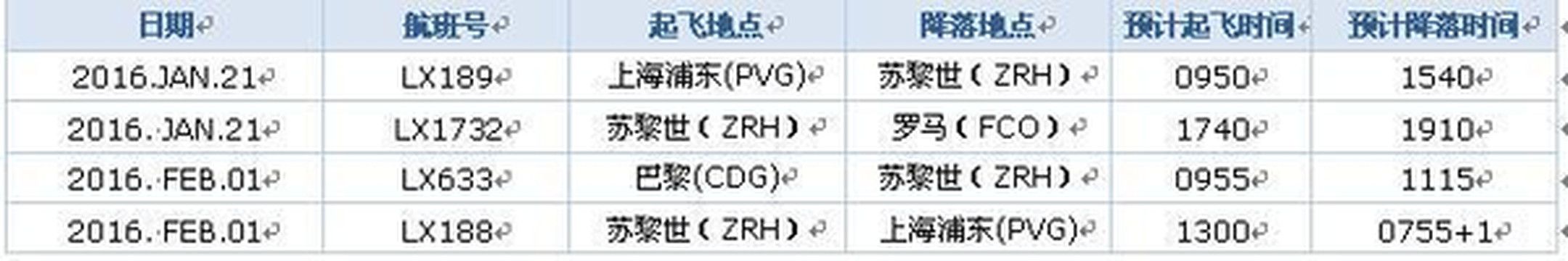 1FEB CDGZRH 0955/1115 转LX 188 1FEB ZRHPVG 1305/0755+1