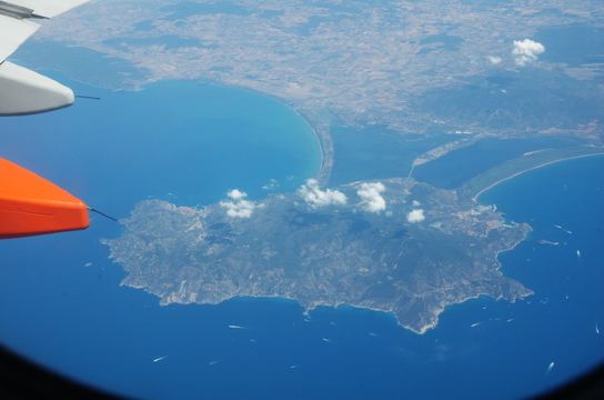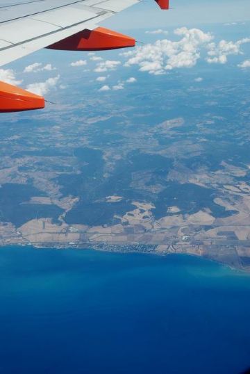 飞机后来一直是沿着地中海飞行,机翼下的意大利海岸线大致呈弧形伸展,优美曲折,途中还看见一个如梭子蟹般的海岛俯卧海面上,有三条跨海公路连接大陆.开始以为是科西嘉岛,后来想想不可能.又过了一会,,机上广播里忽然介绍说,马上经过的海湾就是法国著名的旅游胜地尼斯.尼斯?我们刚刚游览过,这次又能从飞机上欣赏你的美景了!机上一阵骚动,大家都争相把头伸向机窗.机翼下的尼斯,果然是千娇百媚,一幢幢橙黄色的房屋被一丛丛的绿色包围着,那条著名的英国人大道相伴的蓝色海湾如洁白的珍珠项链佩戴在大地母亲的颈项上.