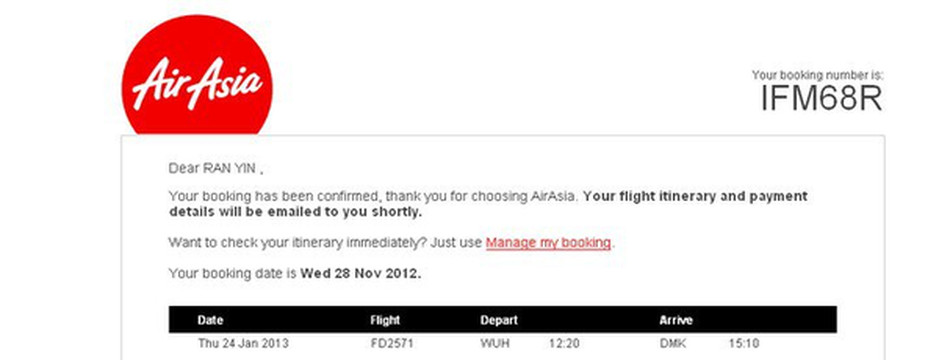 要先在亚航网站注册信息,按照步骤预订好机票付款之后会收到确认的邮件。确认号码一定要记住,登机前打印登机牌需要提供booking number。