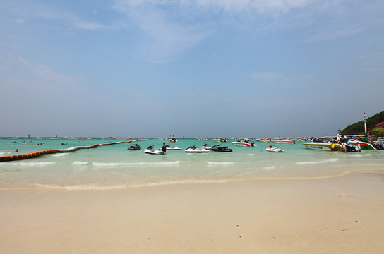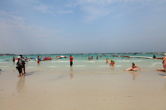 我们要出发去附近的一个小海岛了“”它有着没有清澈的海水已经非常有名的白沙滩。我们跟那导游一直在BARGAIN,每人以1500泰铢成交,游玩项目主要有坐快艇到白沙岛(大概半个多小时),海上摩托车,浮潜以及飞伞。