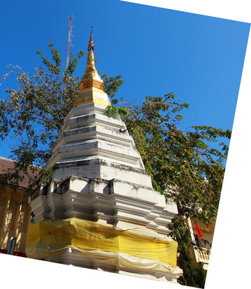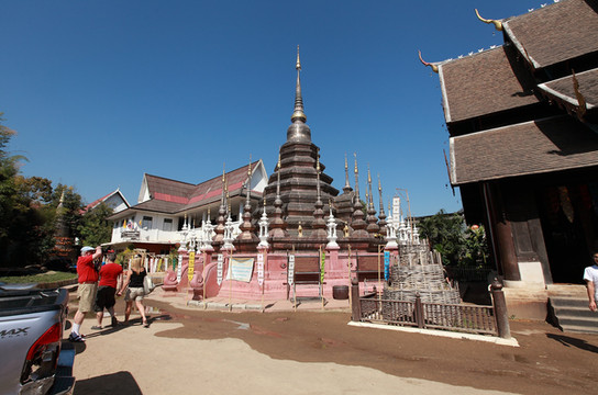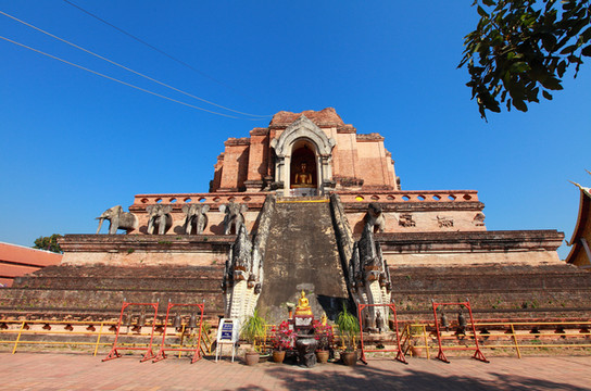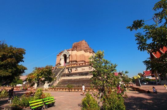 寺内高大的兰纳风格佛塔建于1441年,毁于16世纪的一次地震,但依然是城内最宏伟的建筑。塔南侧有六座象头雕像,其中五个都是后来用水泥修复的赝品,只有最右边用砖头砌成的是真品。遗憾的是,经年累月的风吹日晒,鼻子和耳朵都已损坏。