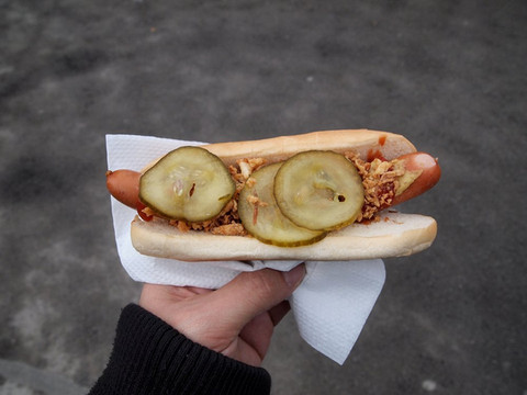 午餐在门口买了一个热狗敷衍了事。