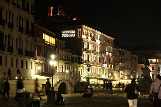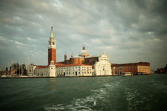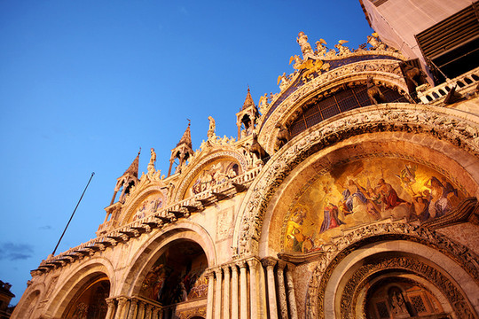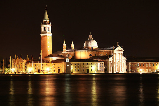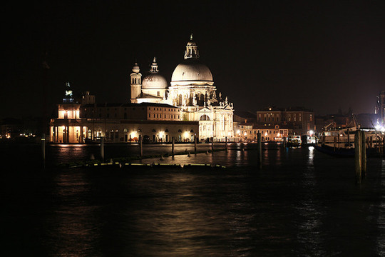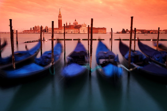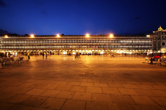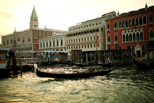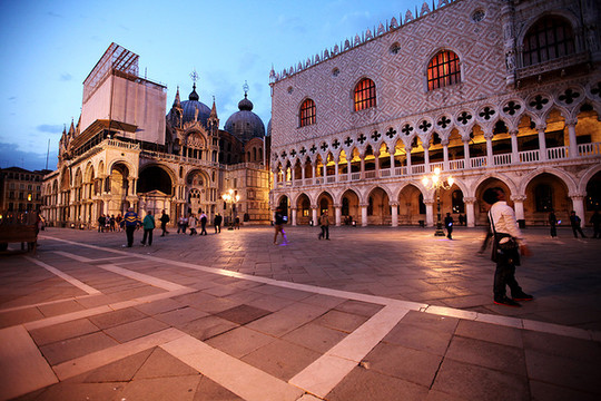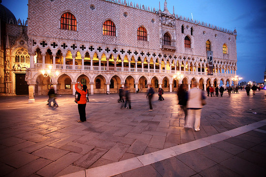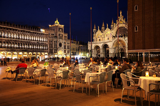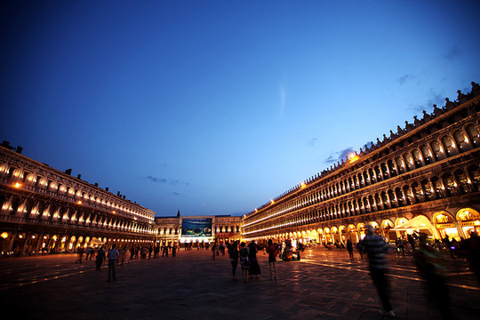 威尼斯的天空渐渐暗了下来,威尼斯的夜悄悄来临。在绚烂的晚霞里,贡多拉静静的在海上飘着,夜幕下的圣马可广场灯火通明。