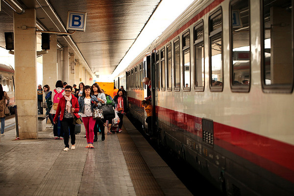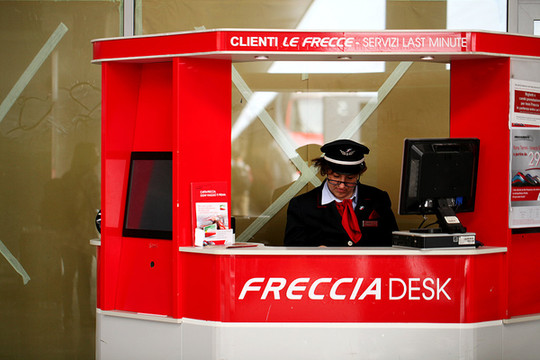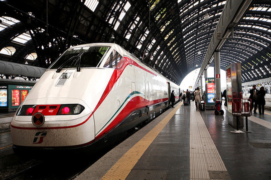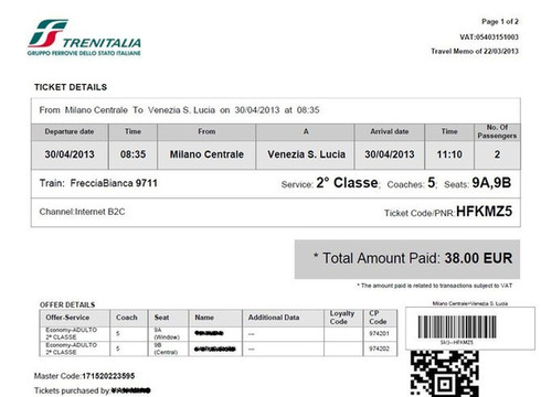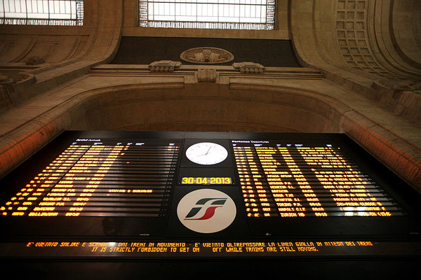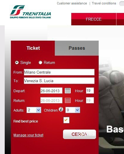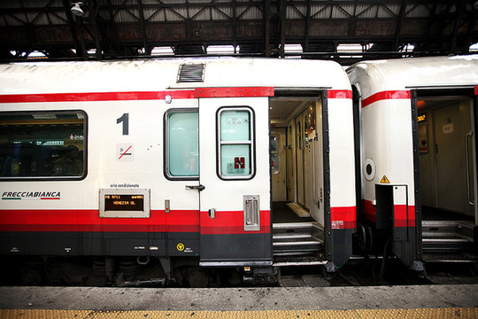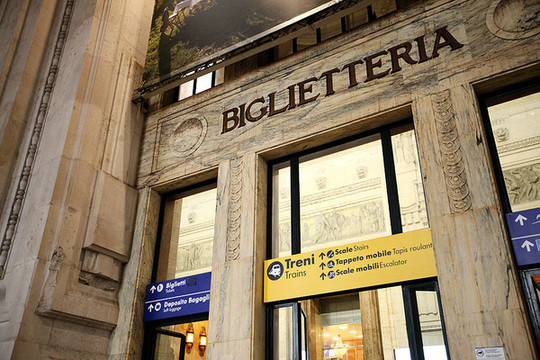 早上睡过头,没有吃酒店的早餐,亏大发啦。我们飞奔到米兰中央火车站腰赶早上8:35的火车。车站买了2欧的羊角面包和卡布奇诺。车票是国内通过意大利铁路网买的折扣票,19欧每人。当时没有看到MINI票,想想总比到了当地买全价票的好。当时买意铁票也是研究了好久,当然买票通过招行信用卡付费的方式也没有出现什么问题。铁路的网址是这个:http://www.trenitalia.com。点最下面FIND BEST PRICE会自动选择最便宜的票子给你。等信用卡刷卡成功会有票据信息出来。然后会发在你的邮箱里面,直接打印就好了。到了火车站直接找到车厢:CLASSES表示X等车,COACHES是X号车厢。车上会有检票的来查票。千万不可以逃票。