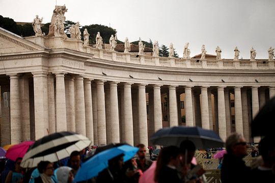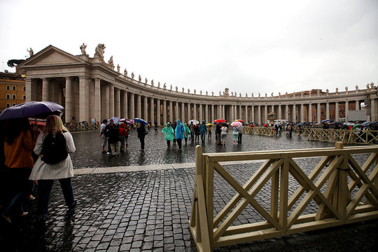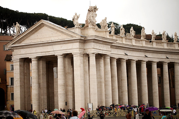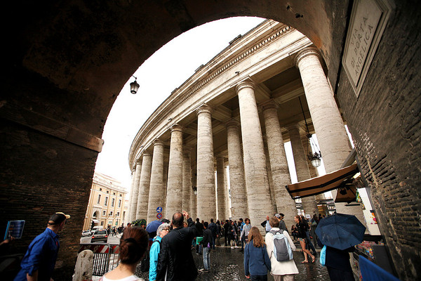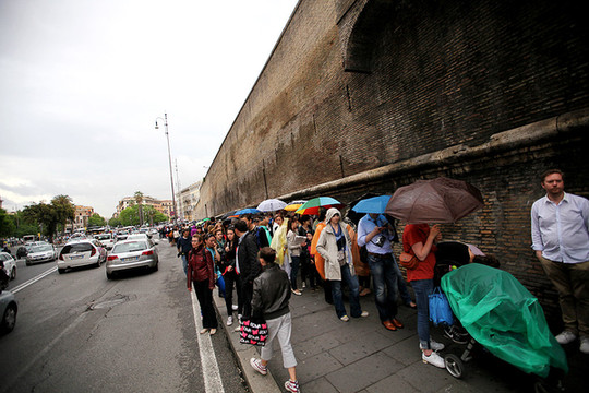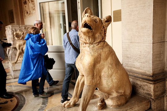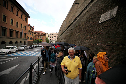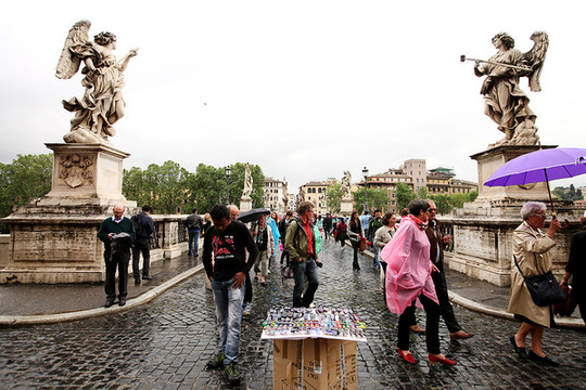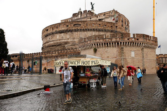 这是一个让人心情不太好的一日,就像是来了大姨妈一样,天空下着暴雨。我们的计划在争吵中没有完成,人的心情跟着天气变得阴晴不定。长时间的旅行随着时间的流逝开始变得不耐烦,逐渐有了争执,没有了刚出发时的欣喜和期待,很多事情的开始不统一,很多路途上的不确定因素随之而来。曾经看过一句话,说两人在一起,结婚前,要一起有一次长途旅行,如果两人克服各种因素,最终可以托付的是在旅行中愿意照顾你的人。凡是经历过磨难,总能见到真情。从出来,看到绕着博物馆城墙排队的人们一直排到了,庆幸提前在官网预约好了的门票,虽然在里面排了一会小队,总的来说还是很顺利的进去参观了。雨越下越大,我的心情跟之越来越不好,人被淋湿,又冷又饿。在附近找了家餐馆坐下吃饭,景点边上的餐馆真的是很黑心,并且不好吃。吃完胃跟着更不舒服了。在大教堂广场看着无数的人排队,一点心情都没有了,钥匙孔造型也没有看到,打算将ROMA PASS的最后一张门票用在圣天使堡,结果悲剧的是没开门。这时候天空开始下起大暴雨,我们开始争吵,无休止的争吵让人头疼,旅行不是一帆风顺,总是伴随着磕磕碰碰,只是看你们愿不愿意一起走下去。
