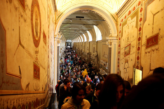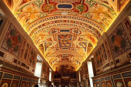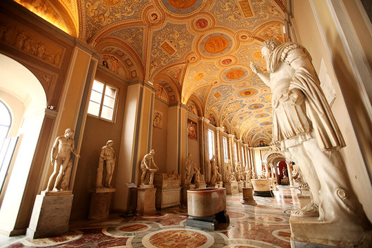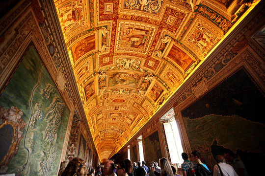 Muse)→ 希腊十字馆(Sala a Croce Greca)→古地图馆(Gallerie delle Carte Geografiche)→ 挂毯馆(Galleria degli Arazzi)→拉斐尔画室(Stanze di Raffaello)→ (Capella Sistina)。