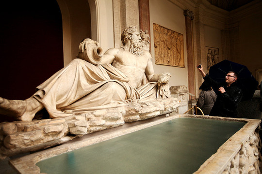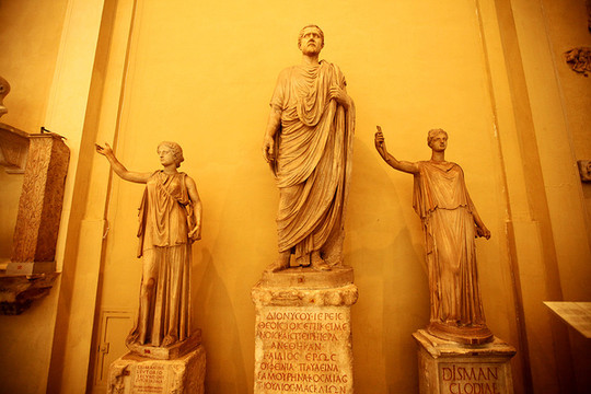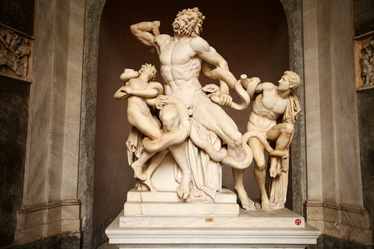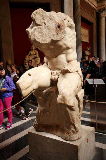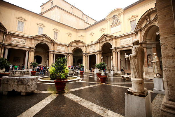 博物馆最好的作品集中在八边形庭院(Octagonal Courtyard),在这里,你会看到著名的拉奥孔雕像(Lacoon),它所展示的是特洛伊祭司和他的两个儿子与巨蟒搏斗的情节。于公元前50年在罗得岛上刻成,但到了1506年才在环形大附近重新被发现。这雕刻品对文艺复兴盛期的艺术产生了很大的影响。庭院中的另一幅作品—著名的阿波罗望景楼(Apollo Belvedere),由艺术家模仿公元前4世纪的一座希腊雕像雕刻而成,被公认是人体美之典范。在刮擦者室里,主要藏品是刮擦者(Apoxyomenos),描绘了一个运动员在摔跤比赛后擦去身上的汗水和尘土的情景