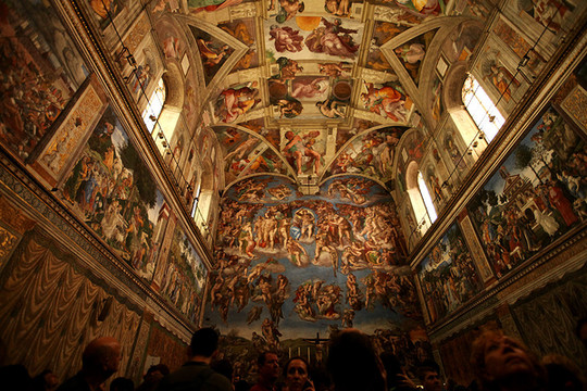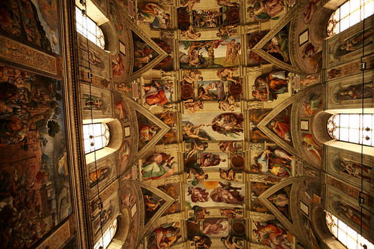 本来只是教皇的一个私用经堂。其教堂内的天顶画,是文艺复兴三杰之一的米开朗基罗的绘画艺术丰碑,它与同一教堂的另一幅壁画《最后的审判》并立为米开朗基罗一生最有代表性的两大巨制。因为米开朗基罗创造了《创世纪》和《最后的审判》而名扬天下。这两幅壁画工程也是意大利文艺复兴盛期最伟大的艺术贡献。 关于米开朗基罗创作西斯庭教堂壁画,有着一段辛酸的历史过程,这里介绍一下它的梗概。1503年,教皇朱理二世取得圣彼得王位后,便想把整个意大利归在他的教权统治下。他要改建,兴修,装饰豪华的宫廷,便请来了建筑家布拉曼特。5年后,教皇为纪念其叔父西克斯特四世,请布拉曼特重建西斯庭小教堂,尔后又把米开朗基罗召来,让他停下正在进行的陵墓雕塑工程,要他涂掉教堂内的旧壁画,为其重绘天顶上的壁画。米开朗基罗没有办法只好接受(据瓦萨里说,布拉曼特与米开朗基罗存有芥蒂,因妒嫉米开朗基罗的雕塑任务,布拉曼特乃说服教皇,使其就范,迫使他放弃雕塑)。米开朗基罗建议让布拉曼特帮助制作绘画脚手架。布拉曼特设计了一个悬挂式吊架,在屋顶上凿了好些窟窿。米开朗基罗气愤地问他画到有窟窿处如何办,后者无言答对。米开朗基罗就禀告教皇,撤掉他的吊架,并羞辱了这位建筑家,要求另请帮手。天顶全部画稿完成后,他决定让助手来完成一部分绘制任务。但这些助手一开始就令米开朗基罗不满,于是再度抹掉已画上的部分,由他独自一人来完成全部天顶画。在这间短廊式的500多平方米的天顶上,画家要完成全部壁画加上装饰,时间长达4年5个月(自1508年5月至1512年10月底),除了配制颜料的助手外,没有第二个人上去帮助他,其绘画工程之浩大和艰巨性甚难想象。当他走下脚手架时,眼睛已经毁坏。事后,他连读信也要把信纸放到头顶上去。那时,米开朗基罗不过37岁,可是那长期高仰脖子的艰苦作业,使他的脸容变得憔悴不堪,已俨然一个多病的老人了。