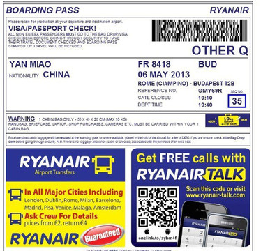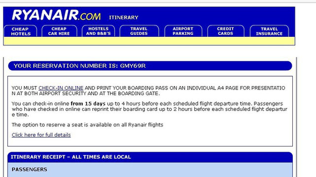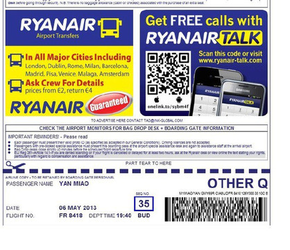 预订流程完成后你之前预留的邮箱会收到电子机票和网上值机的邮件。瑞安都是打印的机票,在飞机起飞前15天至4个小时完成网上值机,并打印出纸质机票就ok啦。飞机起飞前半个小时到机场,以便留出足够的时间登机。