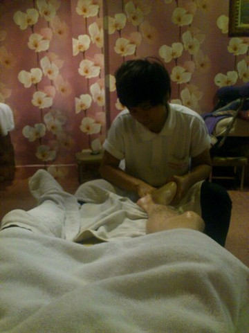 回到酒店已经身心俱疲了,走了一整天的路脚都快散架了。素坤逸路asok这块是外国人聚集的高档酒店区,我们酒店所位于的18号巷泰式按摩店非常多,走到一家叫sweet massage的按摩店,望见里面环境不错,店门口的店员十分热情把我们领进去,内部很幽静,只有一位中国女生在按摩,座椅非常舒适,我躺下后拿起手机,按摩的阿姨很热情给了我一张写有wifi密码的纸条,看我翻起旅行指南,还打起灯来。就这样一边按摩,一边翻手机和书,一会闭目养神。真是太爽了!