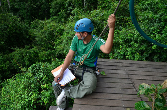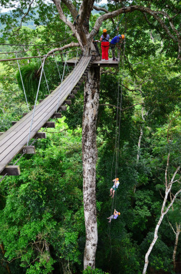 途中遇到钢缆检修人员,检查完一个就滑索飞跃到另一棵树上。期间我们还遇到几个会说汉语的工作人员,其中一个是在台湾长大!