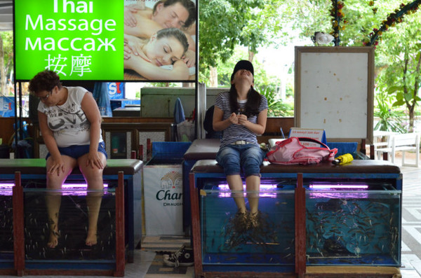 在塔下看到有Fish spa,100B 一个人15分钟,实际上享受时间远超15分钟。这里的服务员会说普通话,但仅限于三个字:“好痒啊”……我猜是游客教会她的。。(如上图。。)