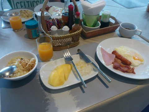用手机匆匆拍摄了一下早点:每天早晨客人入桌时都会现煎一份双黄蛋,还有芒果饭,酸奶、蛋糕、水果都是自助供应,就连果汁都是鲜榨的,还有果肉!大爱啊~