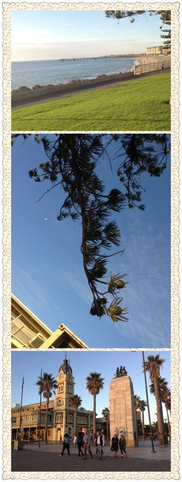 阿德莱德,我又一次回来了,我又一次看见了对“巨人国”的首次印象之地。高大的树木,鸡蛋大的松果,碧蓝的海水,3d般的云彩。看着太阳慢慢下降,落日的余晖金子般星星点点在海面上闪闪发光。漂亮的格雷尔海滩越来越热闹,散步的人们,放学的孩子们,呼朋唤友的聚会人群,本身就是一副美好的图画。海边的房子非常有特色,每家每户都按照自己的喜好装饰着,绝不雷同。院子里面放着不知道何年何月淘来的船矛,巨大的船帆随风飘扬。
